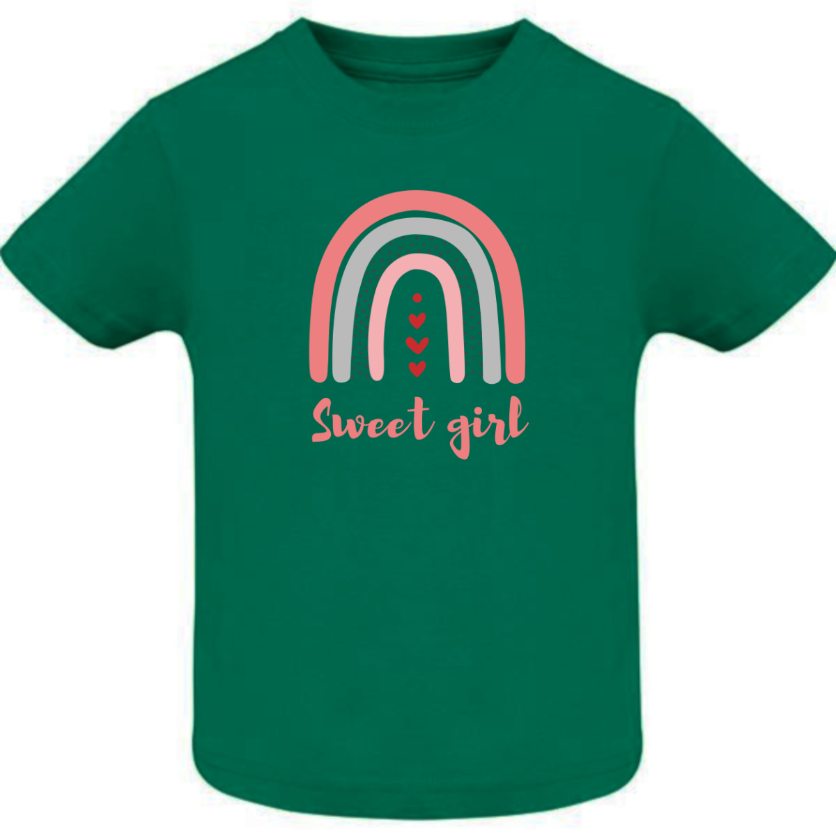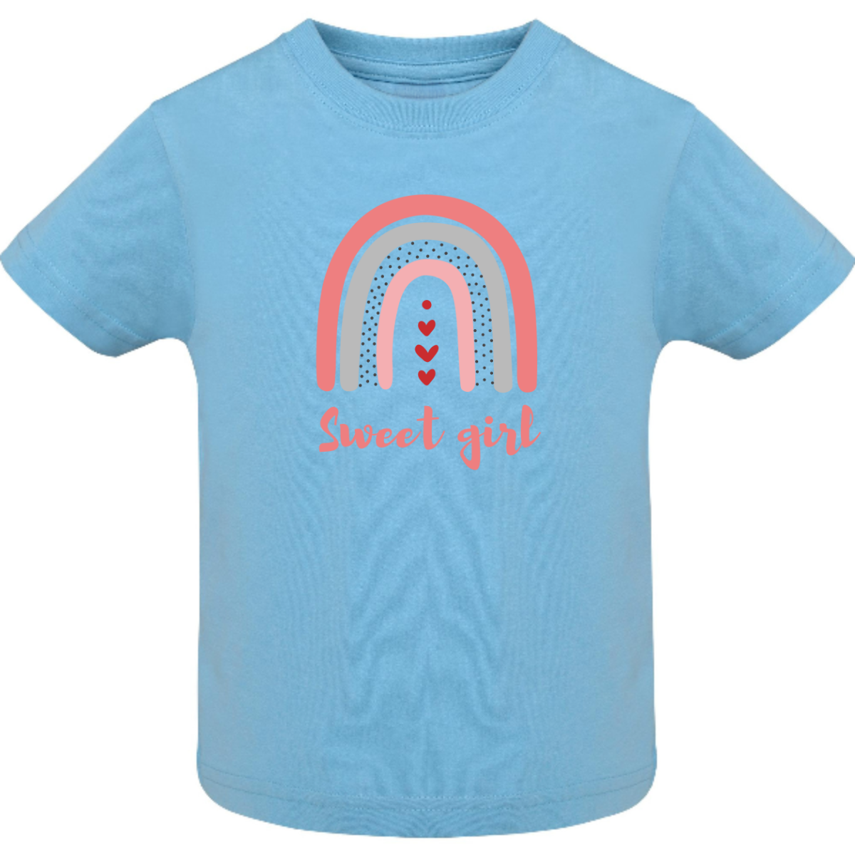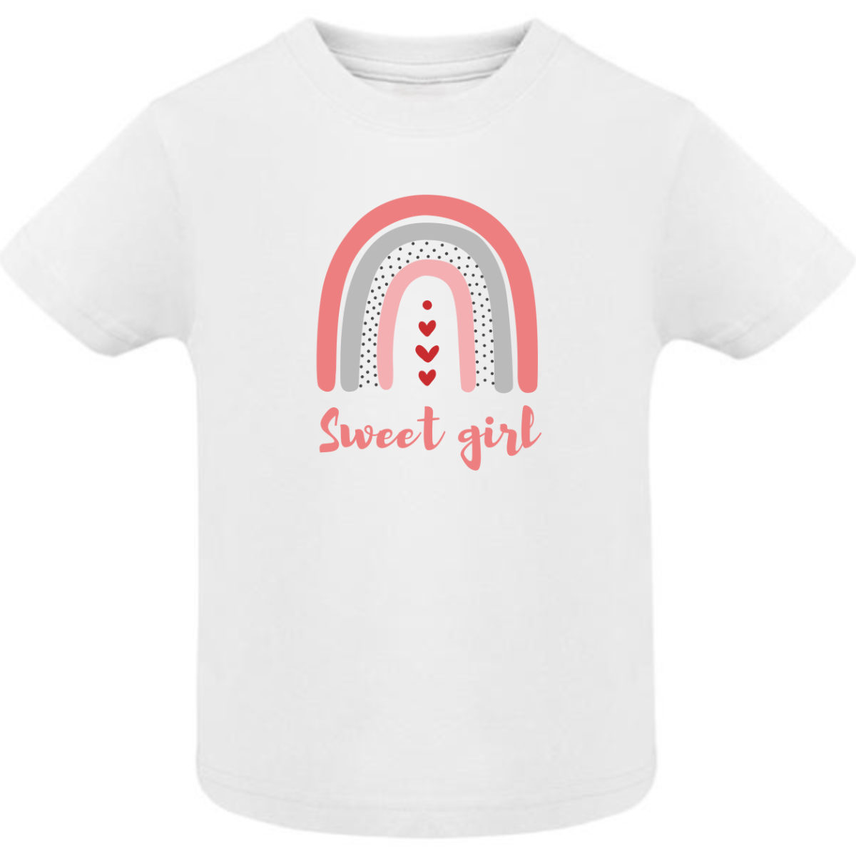 Με ένα όμορφο ουράνιο τόξο σε απαλές αποχρώσεις και την επιγραφή Sweet Girl, το μπλουζάκι αποπνέει τρυφερότητα και κομψότητα.