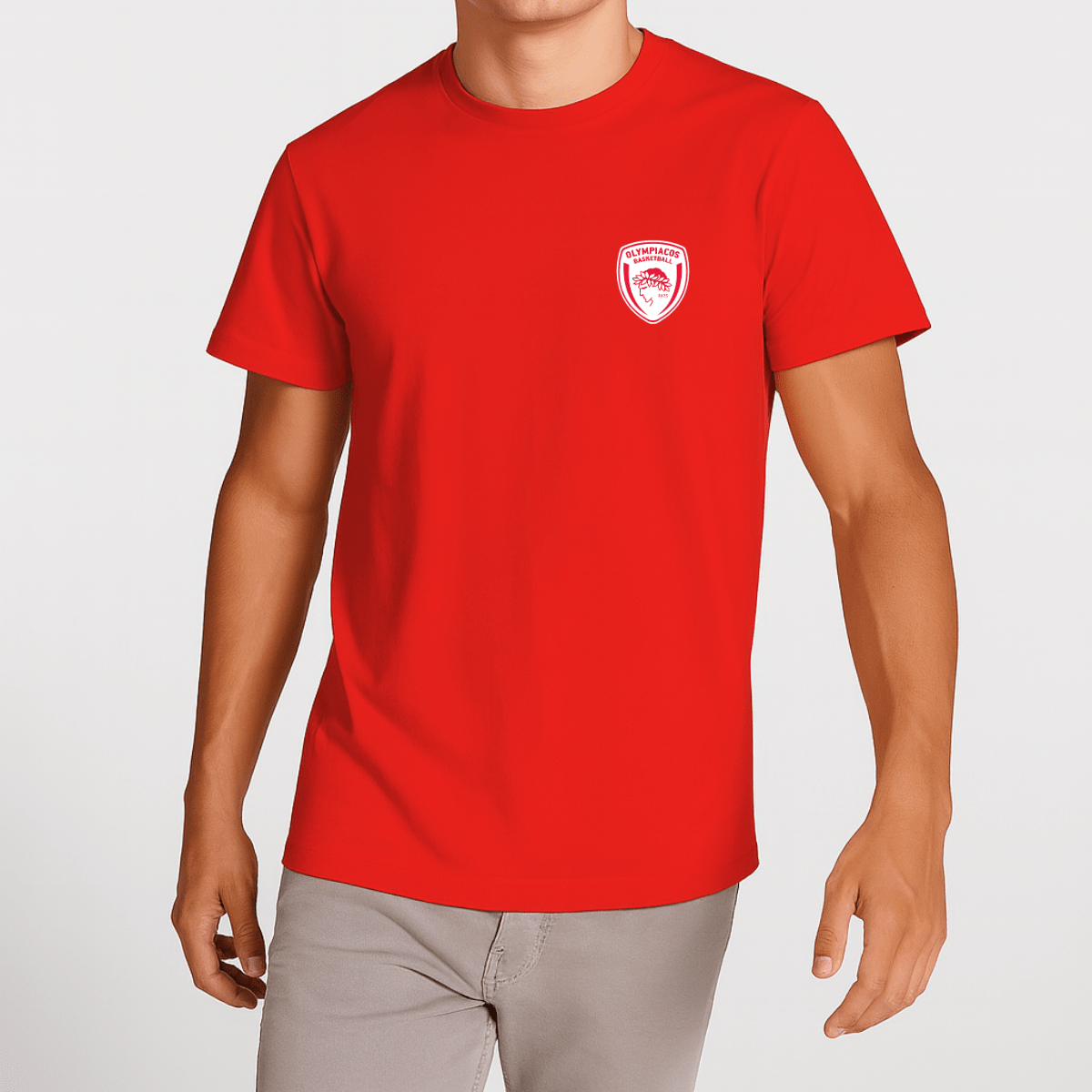 Το εμβληματικό λογότυπο του Ολυμπιακού στο μπροστινό μέρος ολοκληρώνει το look με περηφάνια και χαρακτήρα.